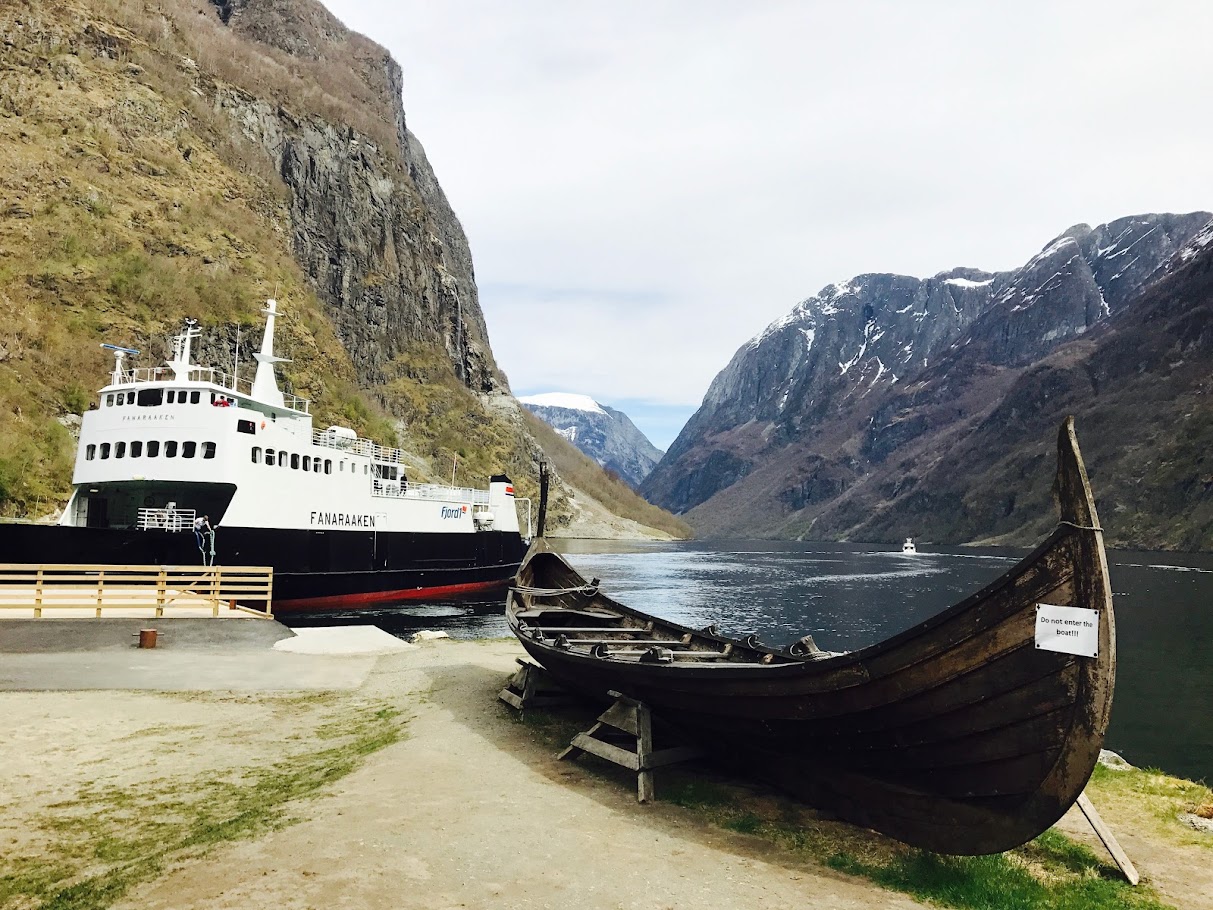 정박해 있는 바이킹 배 모양의 목선 옆으로